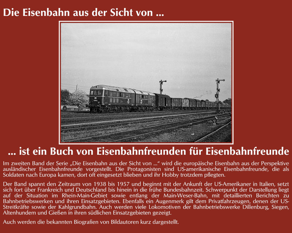 Im zweiten Band der Serie „Die Eisenbahn aus der Sicht von …“ wird die europäische Eisenbahn aus der Perspektive ausländischer Eisenbahnfreunde vorgestellt. Die Protagonisten sind US-amerikanische Eisenbahnfreunde, die als Soldaten nach Europa kamen, dort oft eingesetzt blieben und ihr Hobby trotzdem pflegten.