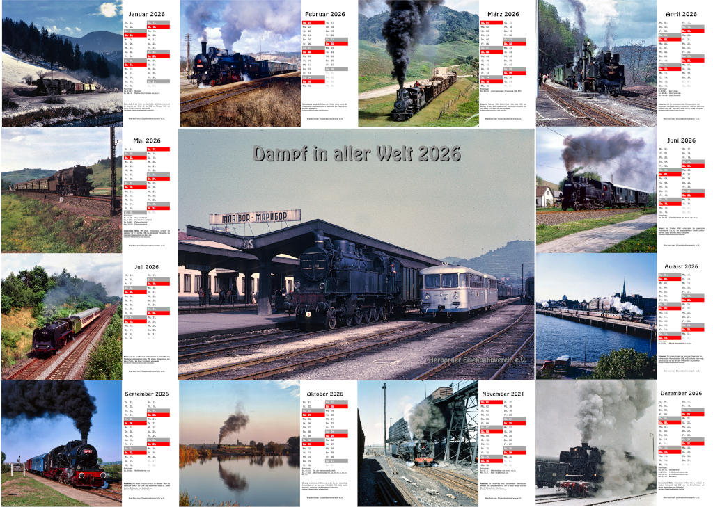 Auch wird es wieder einen Kalender „Dampf in aller Welt“ geben. Enthalten sind in diesem Kalender Aufnahmen aus Bulgarien, Deutschland (BRD), Jugoslawien, Kuba, Österreich, Polen, Rumänien, Schweden, Südafrika, der Tschechischen Republik, Ukraine und Ungarn. Alle Aufnahmen sind Farbaufnahmen und wurden zwischen 1963 und 1995 aufgenommen. Der Kalender wird wieder im formschönen DIN A3-quer-Format erscheinen.